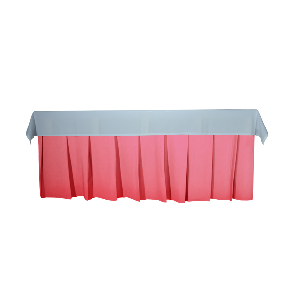 Cobrem as mesas do tampo ao chão, reforçados com fita 100% poliéster (reciclado) e com velcro fêmea para rápida colocação, com pregas discretas de 40 em 40 cms, são alugados individualmente para as nossas mesas ou para qualquer tipo de mesas.